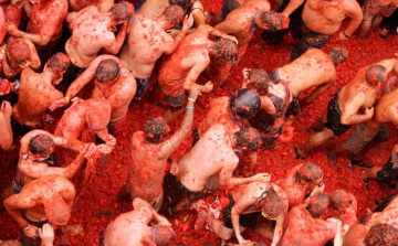 Hét kamionról öntötték a paradicsomot a "csatázók" közé szerdán a spanyolországi Bunolban, ahol 74. alkalommal rendezték meg az óriási nemzetközi ismertségnek örvendő Tomatina fesztivált.